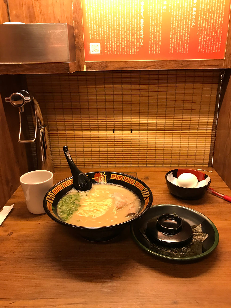 Bien connu, Ichiran Ramen vous propose une seule sorte de ramen, le Tonkotsu ramen. Vous pouvez y ajouter des suppléments tel que du seaweed, un oeuf (btw best oeuf ever), etc. Ce restaurant est particulier car c'est un restaurant cabine. C'est à dire que vous mangez seul face à un comptoir. Vous ne voyez pas vraiment votre voisin car tout est séparé par des petites planches en bois. C'est assez particulier mais c'est une chouette expérience. De plus, vous ne voyez pas les serveurs.