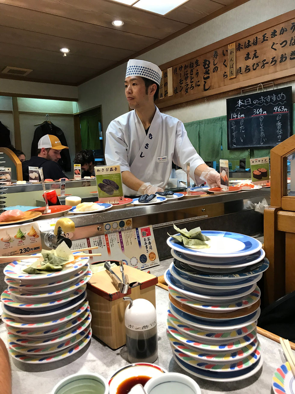 C'est un belt sushi, c'est à dire que les sushis défilent devant vous et vous pouvez prendre ceux que vous voulez. C'est super bon et en plus pas cher! La plupart des assiettes sont composés de deux sushis et coutent 146 Y.